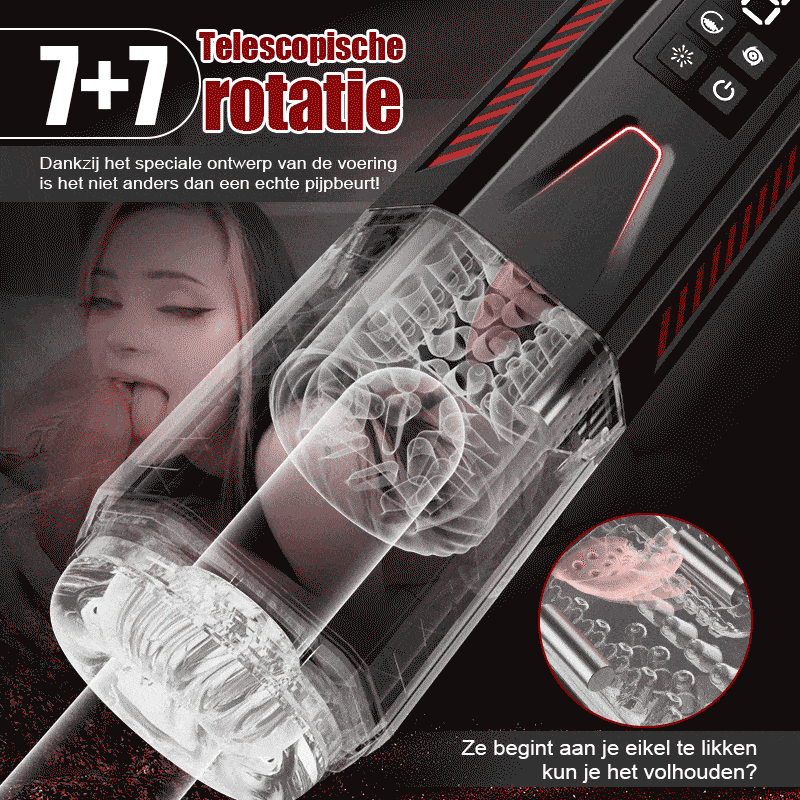 Krachtige 7 zuig- en 7 roterende massage van je penis, met een gesimuleerde zachte ingebouwde tong om je eikel te likken;
