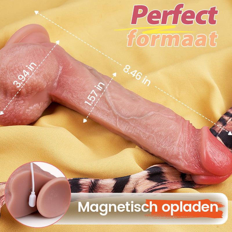 De realistische dildo van 8,46 inch biedt een alles-in-één ervaring met hoge prestaties. Hij combineert zeven stoot- en zwaaimodi, tien vibratiepatronen en een instelbare verwarmingsfunctie voor krachtige en realistische sensaties.